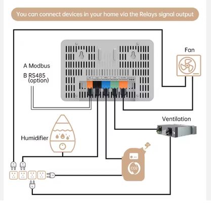 | 단일 출력 배선 | CO2TVOC, PM2.5 및 습도 신호 출력을 위한 RS485/릴레이 |