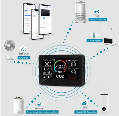 실시간 환경 모니터링 및 스마트 제어 통합을 위해 설계된 Wi-Fi 공기질 측정기를 통해 실내 공기질 문제에 앞서 나가십시오. 이 고급 장치는 CO₂, PM2.5, PM1.0, TVOC, 온도 및 습도를 지속적으로 추적하여 WiFi를 통해 고정밀 데이터를 제공하고 스마트 시스템과의 원활한 통신을 가능하게 합니다.